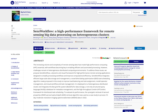 近日,团队研究生尹文萍和刘子琦作为主要作者,在中科院一区TOP期刊《Big Earth Data》发表了一篇关于遥感大数据高性能计算框架的论文。该研究是在其导师薛勇教授(国际欧亚科学院院士、国际宇航科学院通讯院士)的指导下,联合其他学者合作完成的。